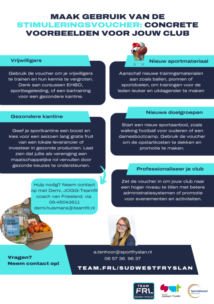 Neem gerust contact op met clubondersteuner Amee ten Hoor (clubondersteuningswf@sportfryslan.nl) voor algemene vragen, of met Demi Huismans (demi.huismans@teamfit.nl) voor vragen over de gezonde sportomgeving.